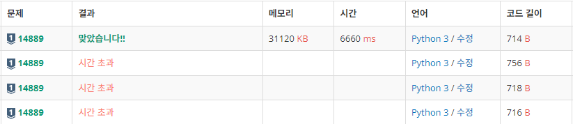 한 달 전쯤 이 문제를 처음 접했을 때 백트래킹으로 모든 조합을 나누려고 했다. 나눴는데 합을 구할 방법이 도저히 떠오르지 않아서 나눈 상태로 냅뒀다. 그리고 오랜만에 도전하며 그냥 처음부터 다른 사람의 코드를 참고하려 했다. 다른 사람의 코드와 달랐던 부분은 단 한 개. 스타트와 링크 나눌 때 if와 elif로 나누지 않고 if if로 나눠도 되겠다 싶어서 제출했는데 시간초과.. 그 부분이 잘못되었나 싶어서 if와 elif로 나눠서 제출했는데도 시간초과가 났고 readline을 넣어도 시간초과가 났다. 알고보니 난 함수의 끝 부분에 backtracking(depth+1, idx+1)로 썼고 그래서 중복제거를 못해서 시간초과가 난거였다.. 미량이의 도움으로 시간초과 부분 해결하고 처음 생각대로 if, if로 나눠도 된다는 것까지 확인!