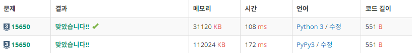 이제 시간초과가 걸릴까봐 PyPy3로 먼저 제출하고 Python3로 제출한다. 재귀함수를 통한 백트래킹과정이라 그런지 걸리는 시간이 적은 것 같다. 입력하는 데이터도 1에서 8까지의 자연수로 작기도 하고!