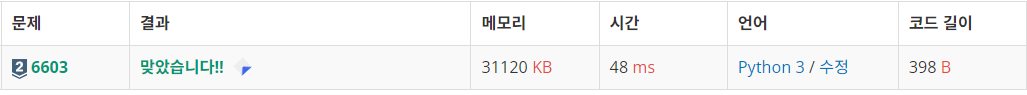 입력은 여러 개의 테스트 케이스로 이루어져 있다. 각 테스트 케이스는 한 줄로 이루어져 있다. 첫 번째 수는 k (6 < k < 13)이고, 다음 k개 수는 집합 S에 포함되는 수이다. S의 원소는 오름차순으로